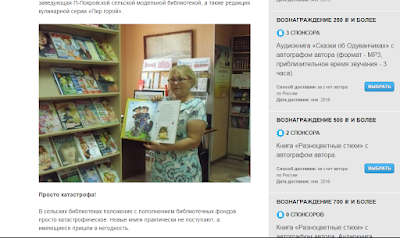 Это вторая - «детская» - часть благотворительной акции «Книги сельским библиотекам». Акция посвящена поддержке маленьких провинциальных библиотек с обветшавшими фондами. Организаторы акции - сообщество «Сельские библиотекари Оренбургской области», модератором которого является Вера Михайловна Филиппова, заведующая П-Покровской сельской модельной библиотекой, а также редакция кулинарной серии «Пир горой». Теперь наша библиотека ждет детские книги от этого проекта! Ура! Мы много потрудились! А за труд и награда!!! Благодарим Бориса Жилина, самого главного спонсора проекта, без него бы проект не состоялся и Ирину Лорину, автора проекта! Молодцы! Спасибо Вам за ваш труд! На 150 600 рублей будут закуплены книги для сельских библиотек! До завершения проекта остается 5 дней!