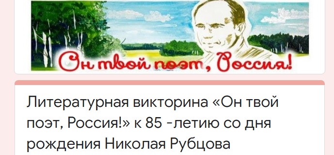Приняли участие в литературной викторине "Он твой поэт, Россия!", посвященной творчеству Н.Рубцова - 85 лет со дня рождения