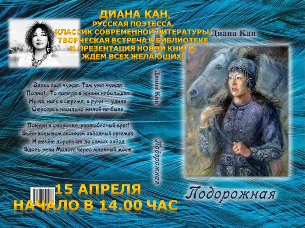 15 АПРЕЛЯ В БИБЛИОТЕКЕ СОСТОИТСЯ ТВОРЧЕСКАЯ ВСТРЕЧА С ДИАНОЙ КАН, РУССКОЙ ПОЭТЕССОЙ, КЛАССИКОМ СОВРЕМЕННОЙ ЛИТЕРАТУРЫ И ПРЕЗЕНТАЦИЯ ЕЁ НОВОЙ КНИГИ "ПОДОРОЖНАЯ"