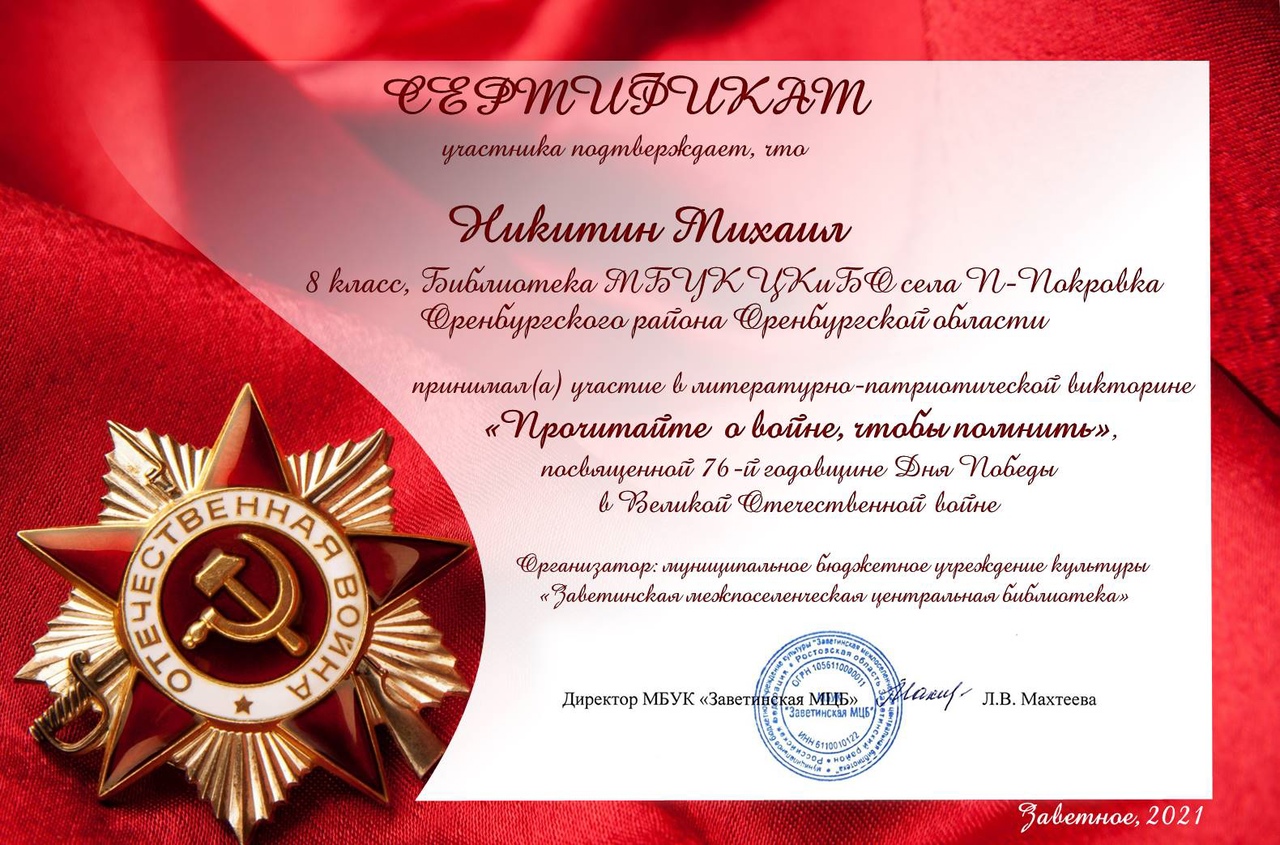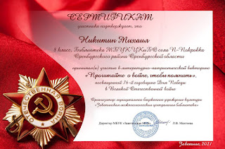 Победитель Международного конкурса "Гордость России" Акимова Анастасия, ученица 1 класса, награжлена Дипломом ll степени в номинации "Строки, опаленные войной". Анастасия проникновенно прочитала стихотворение В. Вологдина, "Не играйте, мальчики, в войну".