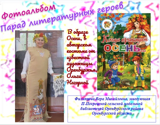Все мы - взрослые и дети - знаем и любим героев книг. Золушка и Красная Шапочка, Баба-Яга и Водяной, Маленькое Привидение и Карлсон... А когда надо, то вполне можем и преобразиться в них. Организаторы акции предложили собрать наши фотопортреты в образе литературных героев и разместить в коллективном фотоальбоме на страницах общей презентации "Парад литературных героев".