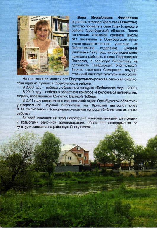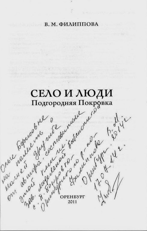 "Есть в Оренбургской области Подгородняя Покровка. Там работает удивительная женщина Верочка Михайловна Филиппова! Я получила от неё замечательный подарок - книгу о людях, которые творили историю этого села. В ней Вера Михайловна рассказывает и своей родной библиотеке, в которой она уже много лет работает заведующей... Я очень рада, что у меня в друзьях есть такие замечательные люди! Спасибо за то, что вы есть!" - О.Б.Акульшина...