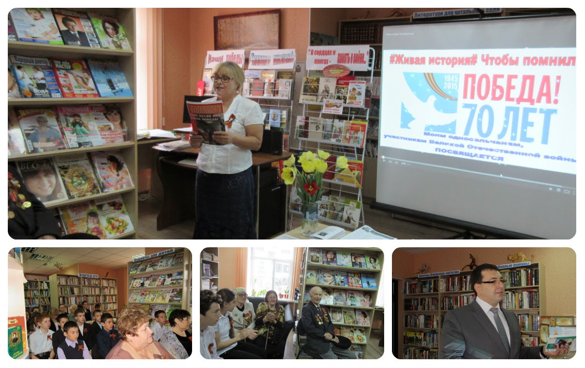 С лучшими произведениями о войне с книжной выстаки "В сердцах и книгах память о войне" познакомила библиотекарь Трифонова О.Н., затем был показан буктрейлер на книгу Богомолова "Иван".Библиотека объявляла конкурс, посвященный 70-летию Великой Победы. Были подведены итоги и всем участникам конкурса были вручены дипломы, благодарственные письма и подарки - книги.