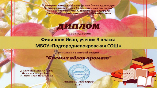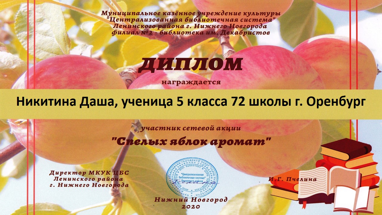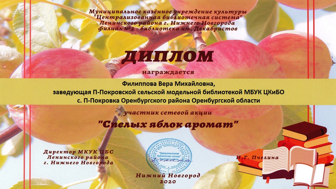 П-Покровская сельская модельная библиотека МБУК ЦКиБО с.П-Покровка Оренбургского района Оренбургской области, принимает участие в сетевой акции "Спелых яблок аромат". Организатор Акции - Муниципальное казенное учреждение культуры «Централизованная библиотечная система» Ленинского района г. Нижнего Новгорода филиал № 2 - библиотека имени Декабристов.
