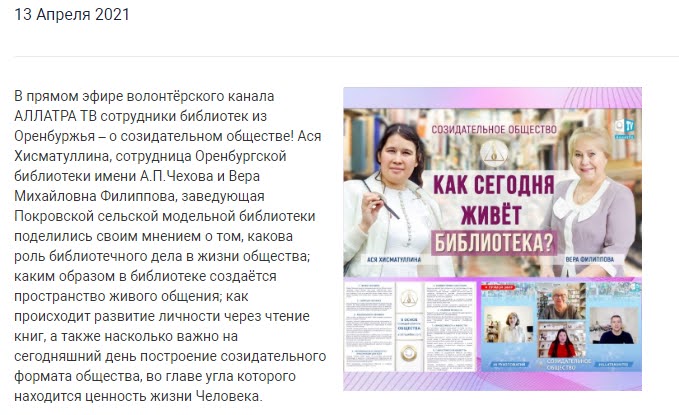 Ася Хисматуллина, сотрудница Оренбургской библиотеки имени А.П.Чехова и Вера Михайловна Филиппова, заведующая П-Покровской сельской модельной библиотеки поделились своим мнением о том, какова роль библиотечного дела в жизни общества; каким образом в библиотеке создаётся пространство живого общения; как происходит развитие личности через чтение книг, а также насколько важно на сегодняшний день построение созидательного формата общества, во главе угла которого находится ценность жизни Человека.