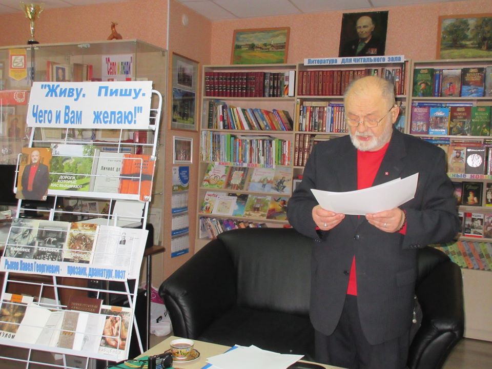 Павел Георгиевич радовал слушателей своими новыми произведениями. Читал отрывок из повести "И ВОЗВРАЩАЕТСЯ ВЕТЕР". Повесть опубликована в журнале "Гостиный двор", любовную лирику и недавно написанные скоморошины из готовящейся ( как он сам надеется) книги, а еще прочитал поэму "Матвевна". Многие женщины прослезились. А как читал! МАСТЕР! Артистично, понятно, ведь только автор так может передать свое произведение, донести до слушателя. Все присутствующие на сегодняшней встрече были очарованы, женщины хотели сфотографироваться с Павлом Георгиевичем, брали автографы. Долго не хотели расходиться.